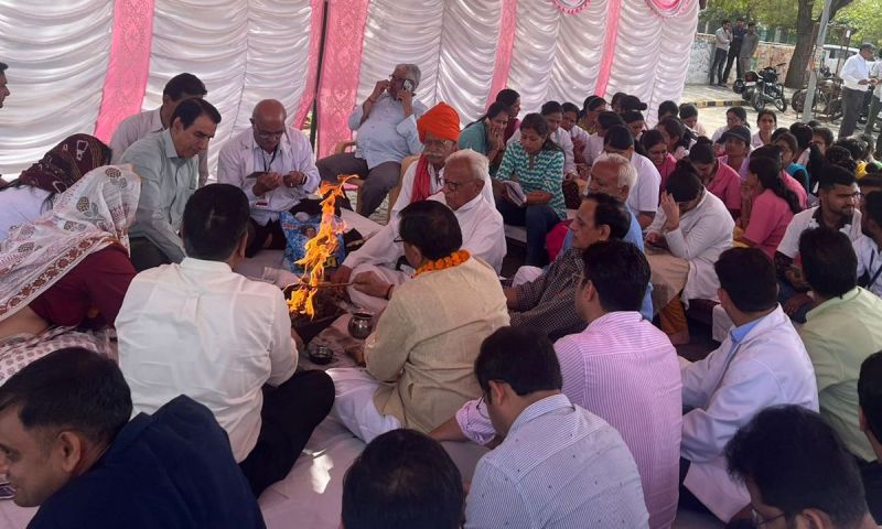 झुंझुनूं. राइट-टू-हेल्थ बिल के विरोध में कलक्ट्रेट के सामने प्राइवेट अस्पताल संघर्ष समिति की ओर से चल रहा धरना शनिवार को जारी रहा। शनिवार को चिकित्सकों ने सरकार की सद्बुद्धि के लिए यज्ञ किया। शनिवार को अनशन पर डॉ. शुभकरण कालेर, डॉ. नफ़ीस क़ुरैशी, डॉ. इरफ़ान चौहान, डॉ. मीना शेखावत, डॉ. प्रियंका बुडानिया व डॉ फ़ारूक़ बैठे। रविवार को अनशन पर डॉ. कपिल तेतरवाल, डॉ. संगीता तेतरवाल, डॉ. पुष्पेंद्र बुडानिया, डॉ मधु राठौड़ , डॉ रवींद्र शेखावत बैठेंगे। धरने को कई संगठनों ने भी समर्थन दिया है।