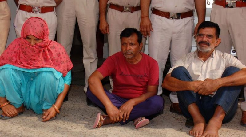 ससुर की हत्या की आरोपी बहू, सफेद शर्ट व ब्लू पेंट में आमदखोर तांत्रिक व लाल टी शर्ट व ब्लू पेंट में सहयोगी जितेंद्र उर्फ विजेंद्र