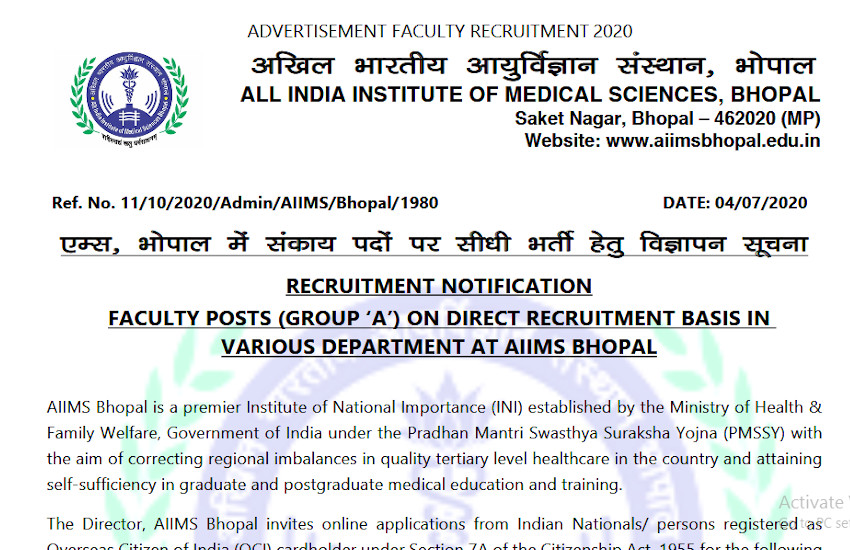 AIIMS Bhopal Recruitment 2020: अखिल भारतीय आयुर्विज्ञान संस्थान, भोपाल ने 'संकाय पदों पर भर्ती के लिए आवेदन आमंत्रित किए हैं। निदेशक, एम्स भोपाल नियमित आधार पर सीधी भर्ती के लिए 165 संकाय पदों के लिए भारतीय नागरिकों (ओसीआई) कार्डधारक के रूप में पंजीकृत भारतीय नागरिकों / व्यक्तियों से ऑनलाइन आवेदन आमंत्रित करता है।