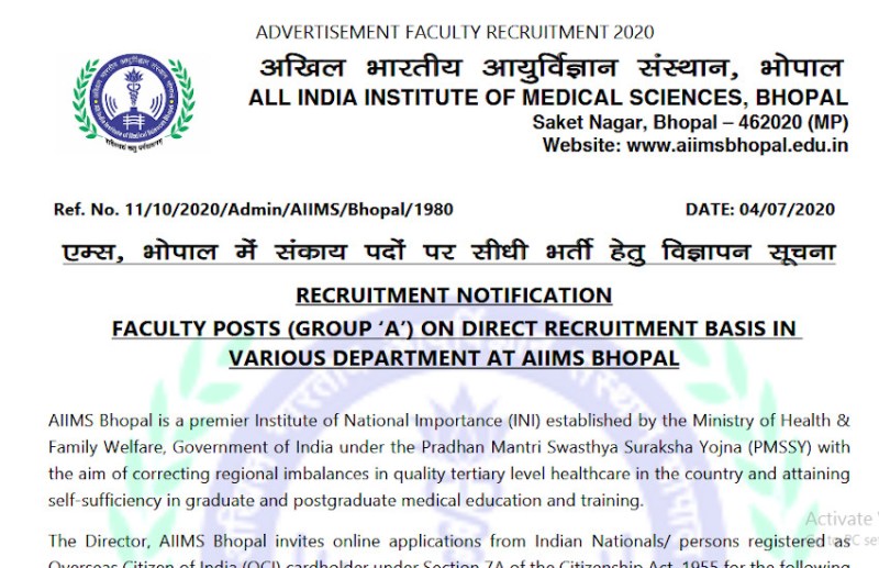 AIIMS Bhopal Recruitment 2020 नोटिफिकेशन के लिए यहां क्लिक करें