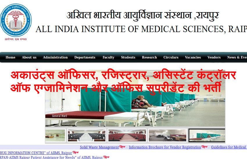 AIIMS यानी अखिल भारतीय आयुर्विज्ञान संस्थान में नौकरी करने की चाह रखने वालों के लिए यह सुनहरा मौका है। AIIMS Raipur Recruitment 2018 के तहत नॉन मेडिकल क्षेत्र की बड़ी भर्ती निकलाी गई है। इसमें अकाउंट्स आॅफिसर, रजिस्ट्रार, असिस्टेंट कंट्रॉलर आॅफ एग्जामिनेशन और आॅफिस सुप्रीडेंट आदि पदों के लिए भर्ती निकाली गई है। इस भर्ती का नोटिफिकेशन 14 मई को जारी किया गया है। इस भर्ती के लिए आवेदन शुरू हैं।