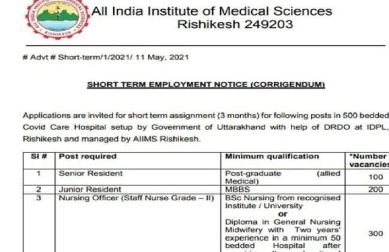 AIIMS Rishikesh Recruitment 2021: सरकारी नौकरी की तलाश कर रहे युवाओं के लिए एक खास खबर है अखिल भारतीय आयुर्विज्ञान संस्थान (AIIMS), ऋषिकेश ने नर्सिंग ऑफिसर, से लेकर टेक्नीकल असिस्टेंट, सीनियर रेजिडेंट और जूनियर रेजिडेंट सहित अन्य पदों पर भर्ती के लिए नोटिफिकेशन जारी किया है। जो उम्मीदवार इस पद को पाने के इच्छुक है वे AIIMS की ऑफिशियल वेबसाइट -airrishikesh.edu.in पर जाकर आवेदन कर सकते है।