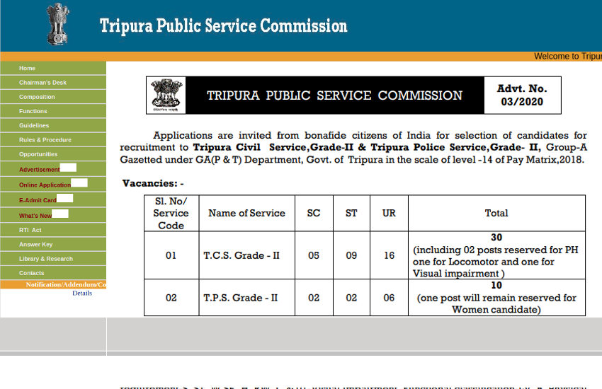 त्रिपुरा सिविल सेवा, ग्रेड- II और त्रिपुरा पुलिस सेवा, ग्रेड- II, समूह- A राजपत्रित के तहत GA (P & T) विभाग, त्रिपुरा में भर्ती के लिए कुल 40 रिक्तियां अधिसूचित की गई हैं। उम्मीदवारों का चयन टीपीएससी ग्रेड 2 के लिए एक लिखित परीक्षा के माध्यम से किया जाएगा जिसमें प्रारम्भिक, मुख्य और व्यक्तित्व परीक्षण शामिल होंगे। अंतिम चयन लिखित परीक्षा और व्यक्तित्व परीक्षण के आधार पर किया जाएगा।