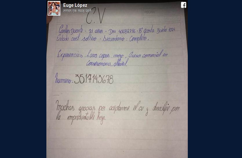 इस घटना का जिक्र करते हुए लोपेज ने अपने फेसबुक पोस्ट में लिखा - उनके कैफे में वैकेंसी नहीं थी। ऐसे में उन्होंने कार्लोस दुआर्टे को अपना रिज्यूमें उनके पास छोड़ने के लिए कहा। लेकिन दुआर्टे ने बताया कि उसके पास रिज्यू्मे प्रिंट कराने के पैसे नहीं है। तब लोपेज ने उससे कहा कि वह एक साधा पेपर पर अपना रिज्यूमे लिख दें। लोपेज ने हाथ से लिखे रिज्यूमे की फोटो अपने फेसबुक पेज पर शेयर कर दी।