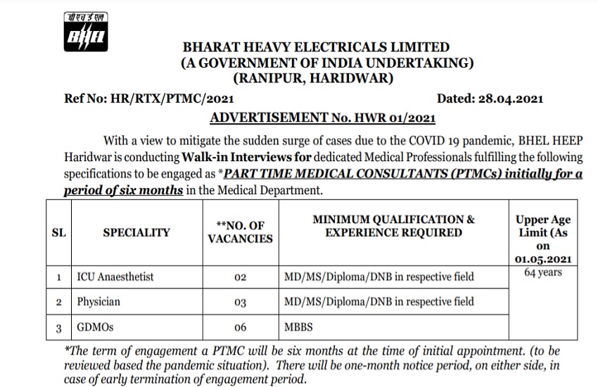 बता दें कि इन पदों पर आवेदन की प्रक्रिया 26 अप्रैल 2021से शुरू हो चुकी है। यह भर्ती PTMC स्पेशलिस्ट और सुपर स्पेशलिस्ट पदों के लिए निकाली गई है।