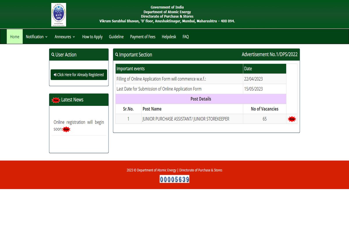 DPS DAE Recruitment 2023: परमाणु ऊर्जा विभाग ने ग्रुप सी के पदों के अंतर्गत जूनियर पर्चेज असिस्टेंट/जूनियर स्टोरकीपर के 65 पदों पर भर्ती के लिए ऑनलाइन आवेदन आमंत्रित किए हैं। आवेदन प्रक्रिया 22 अप्रैल से शुरू हो गयी है और आवेदन पत्र जमा करने की अंतिम तिथि 15 मई, 2023 है। इच्छुक उम्मीदवार आधिकारिक वेबसाइट dpsdae.formflix.in के माध्यम से ऑनलाइन आवेदन कर सकते हैं। उम्मीदवारों की उम्र 18 वर्ष से कम और 27 वर्ष से अधिक नहीं होनी चाहिए। वो कैंडिडेट्स जिन्होंने किसी मान्यता प्राप्त विश्वविद्यालय या किसी अन्य उच्च शिक्षा संस्थान से साइंस या कॉमर्स में ग्रेजुएशन की डिग्री या इंजीनियरिंग में डिप्लोमा किया हो आवेदन कर सकते हैं। आवेदन करते समय 200 रुपये के शुल्क का भी भुगतान करना होगा। आरक्षित वर्ग को नियमानुसार छूट का प्रावधान लागू होगा। कृपया अधिक और विस्तृत जानकारी के लिए आधिकारिक अधिसूचना देखें।
