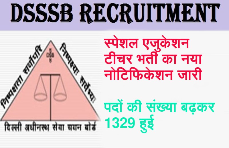 DSSSB Special Education Teacher Recruitment 2018 New Notification के अनुसार अब पदों की संख्या बढ़ा दी गई है। आपको बता दें कि पहले इस भर्ती में 605 पदों की भर्ती की जा रही थी, लेकिन अब इसको बढ़ाकर कुल 1329 पदों की कर दिया गया है। ऐसा इसलिए किया गया है कि क्योंकि बोर्ड को पदों की संख्या बढ़ाने के लिए Delhi Govt की ओर से कहा गया है।