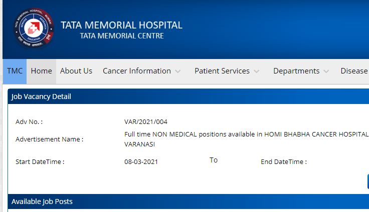Government jobs: टाटा मेमोरियल सेंटर ( TMC Recruitment 2021 ) ने जूनियर इंजीनियर, तकनीशियन, हेल्पर और अन्य पदों पर भर्ती के लिए ऑनलाइन आवेदन आमंत्रित किए हैं। यह भर्तियां होमी भाभा कैंसर अस्पताल,सिविल अस्पताल परिसर,संगरूर,पंजाब में की जानी है। योग्य उम्मीदवार 23 अप्रैल 2021 को वॉक-इन-इंटरव्यू के लिए उपस्थित होंगे।