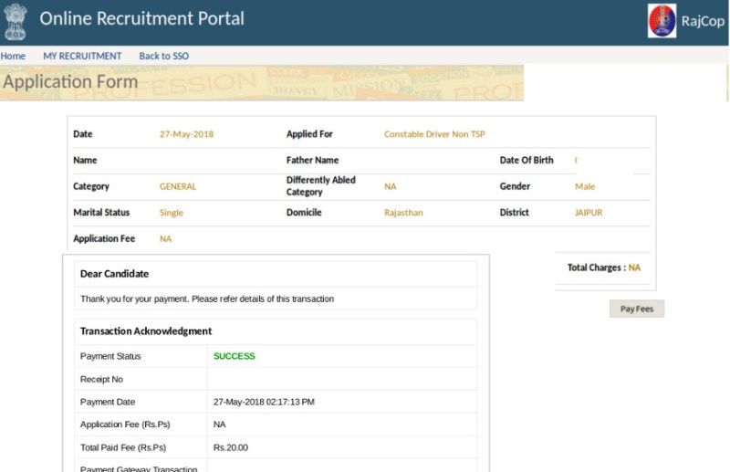 लिंक पर क्लिक करने के साथ ही अभ्यर्थी को पुराने आवेदन पर रिडाइरेक्ट कर दिया जायेगा। यहाँ आपको Apply Now पर क्लिक करना होगा। अभ्यर्थी के सामने SSO पोर्टल पर आवेदन ओपन होगा। आवेदन नए सिरे से करना होगा। सबसे ऊपर वाले कॉलम में पहले से आवेदित का आवेदन क्रमांक डालकर वेरीफाई करना होगा। वैरीफाई होने के बाद चारों स्टेप्स भरने होंगे। आवेदन प्रक्रिया नए सिरे की तरह ही होगी लेकिन आवेदन संख्या पुरानी डालने पर अभ्यर्थी को चौथी स्टेज पर शुल्क भुगतान पर क्लिक करना होगा। Pay Now विकल्प पर क्लिक करने के बाद एक ट्रांजेक्शन की रसीद आएगी जिस पर शुल्क के नाम पर Nill लिखा होगा। मगर भुगतान करने के लिए क्लिक करने पर शुल्क 20 रूपए देने होंगे। 20 रूपए का भुगतान करने के लिए नेट बैंकिंग को भी काम में लिया जा सकता है। राजस्थान पुलिस कांस्टेबल भर्ती पुनः आवेदन की सभी प्रक्रिया पूरी होने के बाद अंत में दो लिंक दिखाई देंगे। जिसमें शुल्क भुगतान रसीद और आवेदन का प्रिंट। अभ्यर्थी नए आवेदन का प्रिंट भी ले सकते हैं।