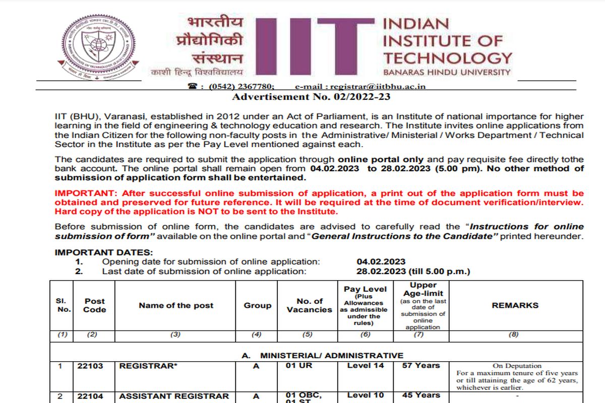 IIT BHU Recruitment 2023: अगर आप जॉब की तलाश कर रहे हैं तो भारतीय प्रौद्योगिकी संस्थान, बनारस हिंदू विश्वविद्यालय (IIT BHU) ने इंजीनियर और अन्य पदों पर भर्ती के लिए आवेदन आमंत्रित किए हैं। योग्य उम्मीदवार आईआईटी बीएचयू की आधिकारिक साइट iitbhu.ac.in के माध्यम से ऑनलाइन आवेदन कर सकते हैं। पदों पर आवेदन करने की अंतिम तिथि 28 फरवरी, 2023 तक है। भारतीय प्रौद्योगिकी संस्थान, बनारस हिंदू विश्वविद्यालय ने रजिस्ट्रार, असिस्टेंट रजिस्ट्रार, जूनियर इंजीनियर और जूनियर टेक्नीशियन के पदों पर भर्ती निकली है। आवेदन करने के लिए 500 रुपये का भुगतान करना होगा। अनुसूचित जाति, अनुसूचित जनजाति, श्रेणियों के अंतर्गत आने वाले उम्मीदवारों को 250 रुपये का भुगतान करना होगा। इच्छुक और योग्य उम्मीदवार iitbhu.ac.in के माध्यम से इन भर्तियों के लिए ऑनलाइन आवेदन कर सकते हैं।