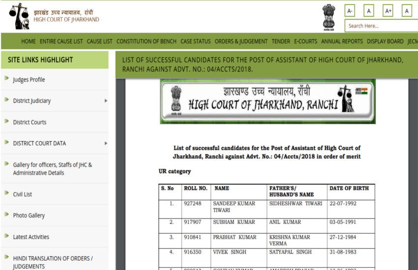 Jharkhand High Court Result 2020 डाउनलोड करने के लिए यहां क्लिक करें