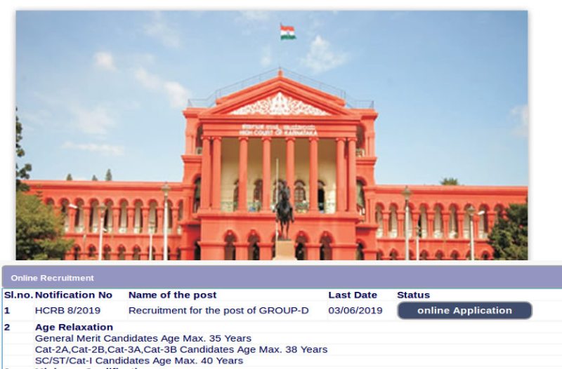 govt jobs 2019 : कर्नाटक उच्च न्यायालय बेंगलूरु ने ग्रुप डी के पदों पर भर्ती के लिए इच्छुक उम्मीदवारों से आवेदन आमंत्रित किए हैं। शैक्षणिक योग्यता और पात्रता संबंधित अन्य जानकारी के लिए अभ्यर्थी विज्ञप्ति को अच्छे से पढ़ें। हाई कोर्ट ग्रुप डी भर्ती के तहत चपरासी, वाच मैन, स्वीपर और हाउस कीपिंग के पदों पर भर्ती की जाएगी। High Court Group D Recruitment 2019 के लिए ऑनलाइन आवेदन करने की अंतिम तिथि 3 जून 2019 हैं। आवेदन ऑनलाइन माध्यम से ही स्वीकार किए जाएंगे।