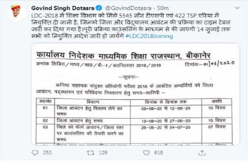 शिक्षा मंत्री गोविंद डोटासरा ने मामले को लेकर ट्वीट किया और कहा कि LDC-2018 में शिक्षा विभाग को मिले 5545 नॉन टीएसपी एवं 422 TSP एरिया में नियुक्ति दी जानी है, जिनको जिला और विद्यालय आवंटन की प्रक्रिया का टाइम टेबल जारी कर दिया गया है। पूरी प्रक्रिया काउंसलिंग के माध्यम से की जाएगी। 14 जुलाई तक सभी को नियुक्ति आदेश जारी हो जायेंगे।