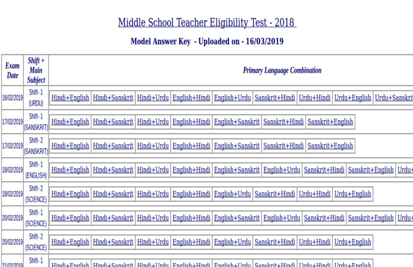 मध्य प्रदेश बोर्ड ऑफ एजुकेशन (MPPEB) ने मिडिल स्कूल शिक्षक पात्रता परीक्षा की उत्तर कुंजी जारी कर दी है। उम्मीदवार, जो 16 फरवरी से 10 मार्च की लिखित परीक्षा के लिए उपस्थित हुए थे, वे आधिकारिक वेबसाइट - peb.mp.gov.in से अपनी उत्तर कुंजी देख सकते हैं। जल्द ही आधिकारिक वेबसाइट पर परिणाम भी जारी किए जाएंगे। माध्यमिक शिक्षा बोर्ड, एमपी ने शिक्षक पात्रता परीक्षा, 2018 के लिए महीने सितंबर-अक्टूबर 2018 के दौरान आवेदन आमंत्रित किए हैं।