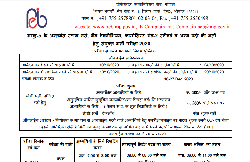 MPPEB Recruitment 2020 : मध्यप्रदेश प्रोफेशनल एग्जामिनेशन बोर्ड ने स्टाफ नर्स, लैब टेक्नीशियन और फार्मासिस्ट सहित अन्य के 2150 पदों पर भर्ती निकाली है। आवेदन 10 अक्टूबर से 24 अक्टूबर के बीच आधिकारिक वेबसाइट http://peb.mp.gov.in पर जाकर कर सकते हैं। 29 अक्टूबर तक ऑनलाइन आवेदन में संशोधन किया जा सकेगा। पात्रता संबंधी सभी जरुरी जानकारी के लिए आधिकारिक नोटिफिकेशन अवश्य पढ़ें।
