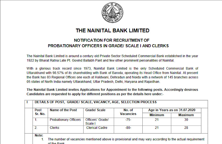 Nainital Bank PO & Clerk Recruitment 2020: नैनीताल बैंक लिमिटेड ने प्रोबेशनरी ऑफिसर और क्लर्क ग्रेड के पदों पर भर्ती के लिए पात्र उम्मीदवारों से ऑनलाइन आवेदन आमंत्रित किए हैं। इच्छुक कैंडिडेट्स अपने आवेदन 15 सितंबर 2020 तक अप्लाई कर सकते हैं। इस भर्ती के लिए बैंक की आधिकारिक वेबसाइट www.nainitalbank.co.in के जरिए ऑनलाइन आवेदन प्रक्रिया 29 अगस्त 2020 से शुरू हो चुकी है। बैंक पीओ या क्लर्क के लिए आवेदन करने वाले उम्मीदवारों को 15 सितंबर से पहले ही आवेदन करना होगा। नैनीताल बैंक उत्तर भारत के पांच राज्यों उत्तराखंड, उत्तर प्रदेश, हरियाणा, दिल्ली और राजस्थान में मौजूद हैं।