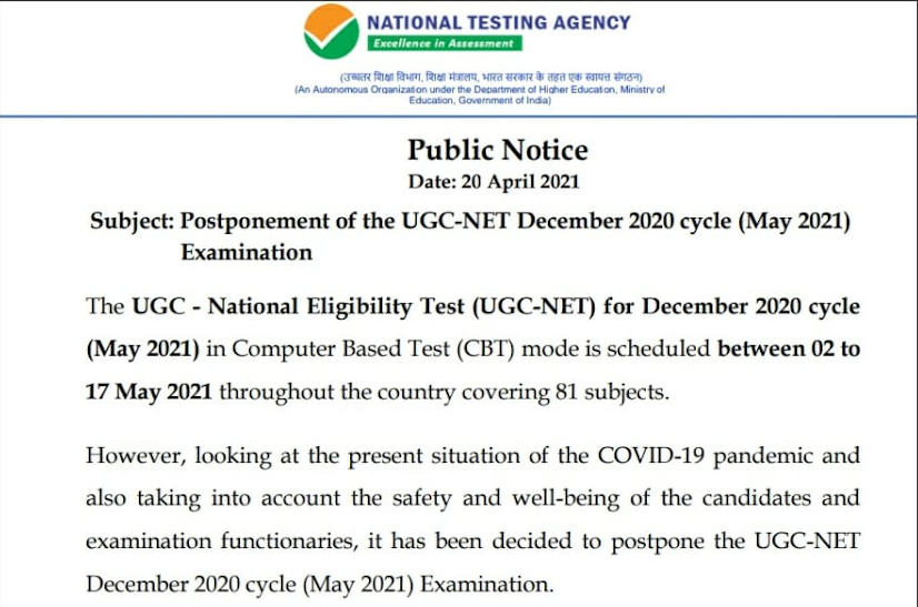 UGC NET May Exam 2021 Postponed: कोरोना संक्रमण के मामलों में वृद्धि के चलते नेशनल टेस्टिंग एजेंसी ने यूजीसी नेट 2021 को स्थगित कर दिया है। कोरोना महामारी को ध्यान में रखते हुए केंद्र और राज्य सरकारें एहतियात के तौर पर हरसंभव कोशिश कर रही है। सीबीएसई और अन्य राज्यों के शिक्षा बोर्ड भी परीक्षाएं रद्द और स्थगित करने के फैसले ले चुके हैं। हाल ही में नीट पीजी और जेईई मेन परीक्षा को स्थगित कर दिया गया है। कल यूपीएससी और एसएससी द्वारा परीक्षाएं स्थगित किए जाने के बाद NTA UGC NET 2021 Postponed कर दी गई है। परीक्षार्थियों के सामने परीक्षा केंद्र तक पहुँचने की चुनौती थी। राष्ट्रीय पात्रता परीक्षा के लिए सफलतापूर्वक आवेदन करने वाले उम्मीदवार परीक्षा से संबंधित लेटेस्ट अपडेट के लिए एनटीए की आधिकारिक वेबसाइट को समय-समय से चेक करते रहें। जल्द ही नई तिथियों की घोषणा की जाएगी।