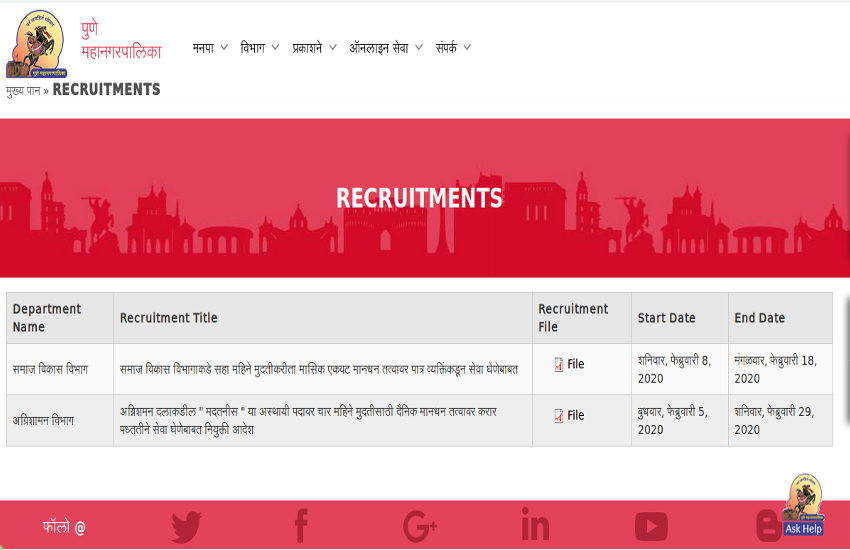 PMC Recruitment 2020: पुणे नगर निगम (पीएमसी) ने कार्यालय सहायक, स्वच्छता पर्यवेक्षक और अन्य की भर्ती के लिए एक अधिसूचना जारी की है। इच्छुक उम्मीदवार उपरोक्त पदों पर 18 फरवरी 2020 या उससे पहले आवेदन कर सकते हैं। आवेदन करने से पूर्व पात्रता संबंधी सभी जरुरी जानकारी के लिए आधिकारिक नोटिफिकेशन जरूर पढ़ें।