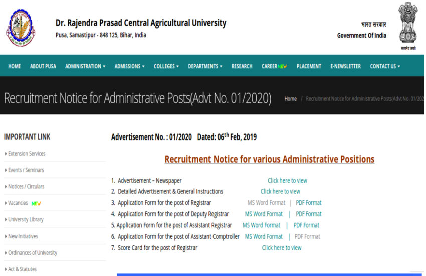 RPCAU Recruitment 2020: डॉ. राजेंद्र प्रसाद केंद्रीय कृषि विश्वविद्यालय (RAU) ने रजिस्ट्रार, एकाउंटेंट और अन्य के पदों पर भर्ती के लिए आवेदन आमंत्रित किए हैं। इच्छुक उम्मीदवार निर्धारित प्रारूप में 7 मार्च 2020 तक आवेदन कर सकते हैं। आवेदन करने से पूर्व पात्रता संबंधी सभी जरुरी जानकारी के लिए आधिकारिक नोटिफिकेशन अवश्य पढ़ें।