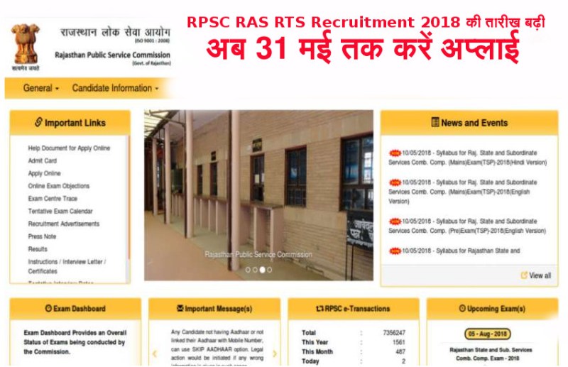 RPSC RAS RTS Recruitment 2018 में Apply करने वाले उम्मीदवारों के लिए खुशखबरी है। RPSC RAS RTS Recruitment 2018 में अप्लाई करने की तारीख को आगे बढ़ा दिया गया है। आरपीएससी ने ऐसा अपने आफिशियल वेबसाइट के सर्वर पर लोड ज्यादा होने के कारण किया गया है। इस भर्ती के लिए अप्लाई करने की आखिरी तारीख पहले 15 मई थी। लेकिन सर्वर पर लोड होने के कारण वेबसाइट बहुत स्लो हो गई। इस वजह से आरएएस एवं अधीनस्थ सेवाएं 2018 सहित अन्य भर्तियों के ऑनलाइन फार्म भरने की तिथि 31 मई तक बढ़ा दी गई हैं। सचिव पी. सी. बेरवाल के मुताबिक पूर्व में इन भर्तियों के लिए ऑनलाइन फार्म भरने की तिथि 15 मई थी, लेकिन अब इसमें राहत देते हुए आगे बढ़ा दिय गया है।