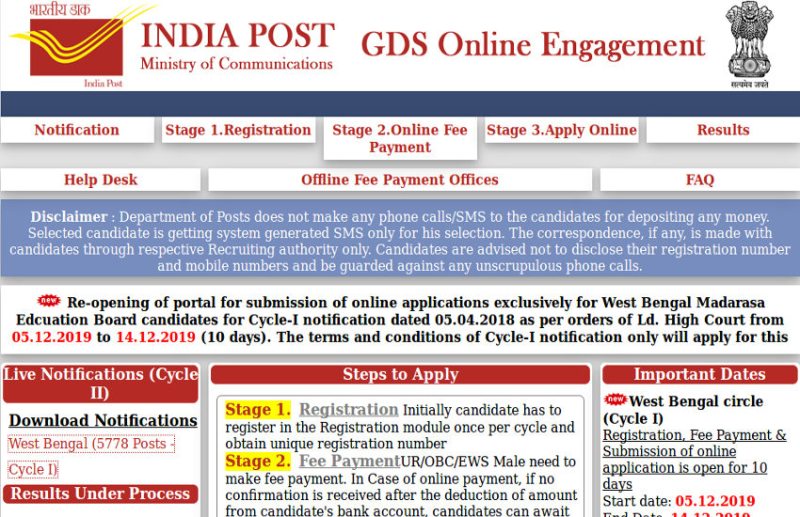 Sarkari Naukri: इंडिया पोस्ट ने पश्चिम बंगाल सर्कल के तहत ग्रामीण डाक सेवक (GDS) के 5778 पदों पर भर्ती के लिए आवेदन आमंत्रित किए हैं। आधिकारिक वेबसाइट के “Ld के आदेशों के अनुसार दिनांक 05.04.2018 को Cycle-I अधिसूचना के लिए पश्चिम बंगाल मदरसा शिक्षा बोर्ड के उम्मीदवारों के लिए विशेष रूप से ऑनलाइन आवेदन जमा करने के लिए पोर्टल को फिर से खोला गया है। उच्च न्यायालय 05.12.2019 से 14.12.2019 (10 दिन) तक। साइकल- I अधिसूचना के नियम और शर्तें केवल इसके लिए लागू होंगी ”