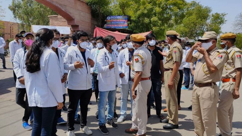 जोधपुर. डॉ सम्पूर्णानंद मेडिकल कॉलेज सहित प्रदेश के सभी आठ सरकारी मेडिकल कॉलेज के करीब 1350 इंटर्न डॉक्टर्स ने शुक्रवार से अनिश्चितकालीन हड़ताल शुरू की। जोधपुर से 250 इंटर्न हड़ताल पर उतरे। इंटर्न ने सुबह एमडीएम अस्पताल के बाहर विरोध प्रदर्शन किया और चिकित्सा मंत्री के विरुद्ध नारेबाजी की। इसके बाद मेडिकल कॉलेज तक रैली भी निकाली। प्रदेश में धारा-144 लगी होने के बावजूद बड़ी संख्या में इकठ्ठा होकर रैली निकालने पर पुलिस भी मौके पर पहुंची और इंटर्न छात्रों से समझाइश की। इंटर्न के समर्थन में कॉलेज के रेजिडेंट डॉक्टर्स ने भी सुबह 8 से 10 बजे तक दो घंटे का कार्य बहिष्कार किया। अगर इंटर्न की मांगें नहीं मानी जाती है तो वे शनिवार को भी हड़ताल पर रहेंगे।