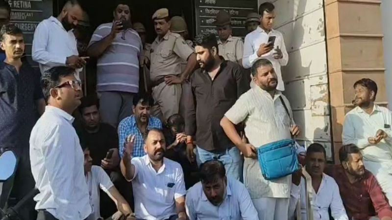 अस्पताल के बाहर धरना देते परिजन व समाज के लोग