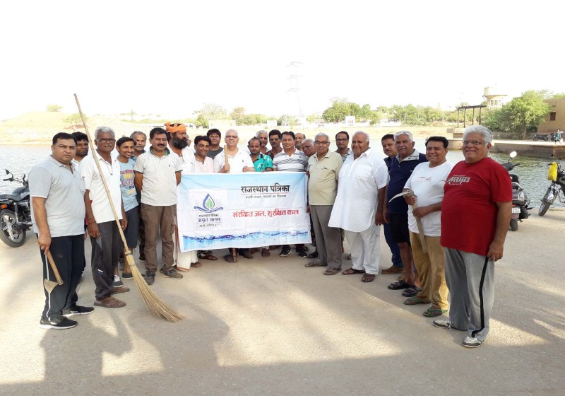 फलोदी. अमृतं जलम अभियान के तहत शिवसर तालाब पर श्रमदान करने पहुचे स्वयंसेवक