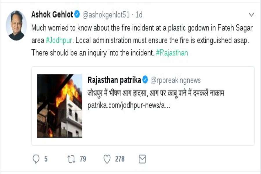 जोधपुर में आग की घटना पर अशोक गहलोत ने जताई संवेदना, पत्रिका की खबर की शेयर