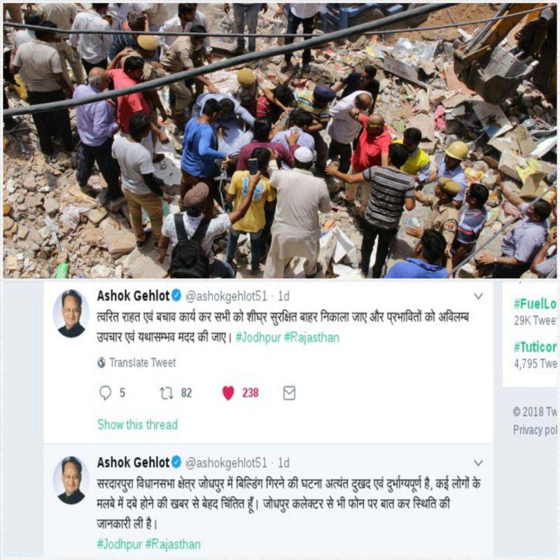 जोधपुर . सरदारपुरा विधानसभा क्षेत्र के विधायक व पूर्व मुख्यमंत्री अशोक गहलोत ने ट्वीट के माध्यम से जोधपुर में उनके विधानसभा क्षेत्र में हुए बहुमंजिला इमारत गिरने की घटना पर संवदेना व्यक्त की है। उन्होंने अपने दो ट्वीट कर लिखा है - सरदारपुरा विधानसभा क्षेत्र जोधपुर में बिल्डिंग गिरने की घटना अत्यंत दुखद एवं दुर्भाग्यपूर्ण है, कई लोगों के मलबे में दबे होने की खबर से बेहद चिंतित हूं। जोधपुर कलक्टर से भी फोन पर बात कर स्थिति की जानकारी ली है। त्वरित राहत एवं बचाव कार्य कर सभी को शीघ्र सुरक्षित बाहर निकाला जाए और प्रभावितों को अविलम्ब उपचार एवं यथासम्भव मदद की जाए।