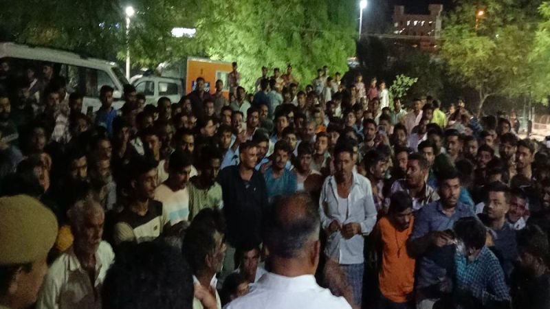 चालान बनाने को लेकर उपजे विवाद के बाद बालेसर थाने के बाहर एकत्रित ग्रामीण।