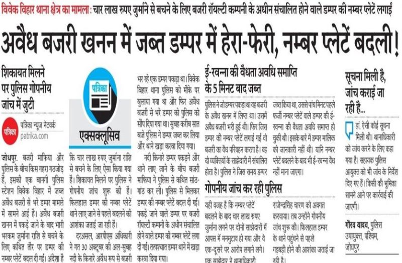 30 अक्टूबर की अल-सुबह आरपीएस अधिकारी ने विवेक विहार थाना क्षेत्र में बजरी के अवैध खनन में लिप्त एक डम्पर पकड़ा था। जिसे थाने ले जाकर जब्त किया गया था। इस बीच में पुलिस ने डम्पर के नम्बर प्लेट अथवा डम्पर बदल दिया था। उसक जगह ई-रवन्ना वाला डम्पर को जब्त करवा दिया था। राजस्थान पत्रिका ने दो नवम्बर के अंक में पृष्ठ-3 पर 'अवैध बजरी खनन में जब्त डम्पर में हेरा-फेरी, नम्बर प्लेटें बदली!' शीर्षक से समाचार प्रकाशित कर बजरी माफिया व पुलिस में मिलीभगत उजागर की थी। जिस पर पुलिस ने कांस्टेबल को निलम्बित कर प्राथमिकी जांच करने के आदेश दिए हैं।
