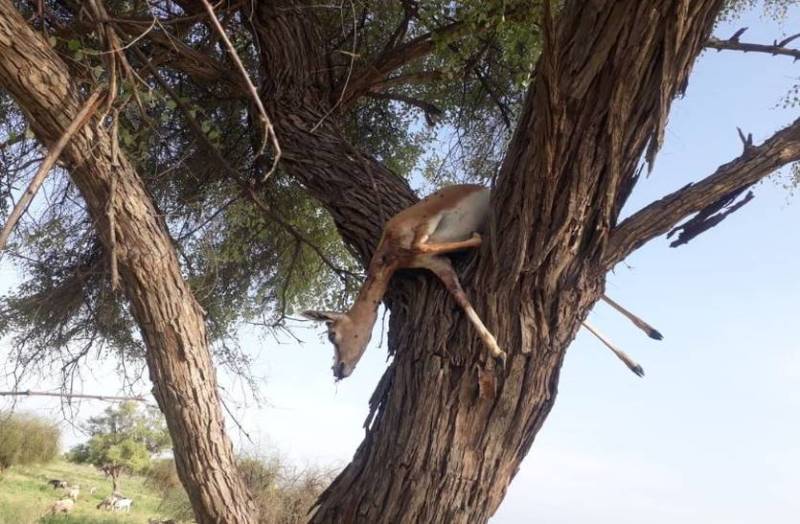 इस दौरान शिकारी बिना नम्बरी मोटरसाइकिल व शिकार किए गए हिरण को एक बोरडी़ के पेड़ पर लटका कर भाग छूटे। रात्रि का समय होने तथा झाडिय़ों के कारण हिरण व मोटरसाइकिल ग्रामीणों को दिखाई नहीं दी। रविवार दोपहर पशु चरवाहे की नजर हिरण व मोटरसाइकिल पर पड़ी तो उन्होंने ग्रामीणों को सूचना देकर बुलाया। सूचना के बाद मतोड़ा थाने से जाब्ता भी आ गया।