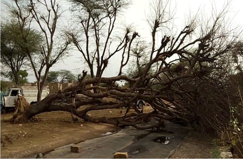 वही बेलवा से बालेसर जाने वाले सड़क मार्ग पर रावलगढ़ गांव में विशाल बबूल का पेड़ उखकर धराशाही हो गया। बबूल गिरने के बाद सड़क मार्ग पर यातायात बाधित रहा। वाहन चालकों ने पास के खेत की तारबंदी तोड़कर वाहनों को जाम से निकाला। वही सुबह प्रशासन को जानकारी नही होने से कोई राहत नही मिल पाई है। कई गांवो में पेड़ पौधों के भी धराशाही होने की सूचना है। गांवो में तूफान के बाद जमकर बारिश हुई। जिससे तापमान में गिरावट आने के साथ ही सुबह ठंडी हवाओं का दौर शुरू हो गया। वही मंगलवार यानी कि आज अलसुबह ५:३० से बारिश शुरू हो गई। जो पिछले आधे घंटे से जारी है। दिन में तूफान को लेकर चले तबाही के वायरल सोशल मीडिया मैसेज के बाद आधी रात में आए बवंडर ने एकबारगी लोगों की सांसें थमा दी।