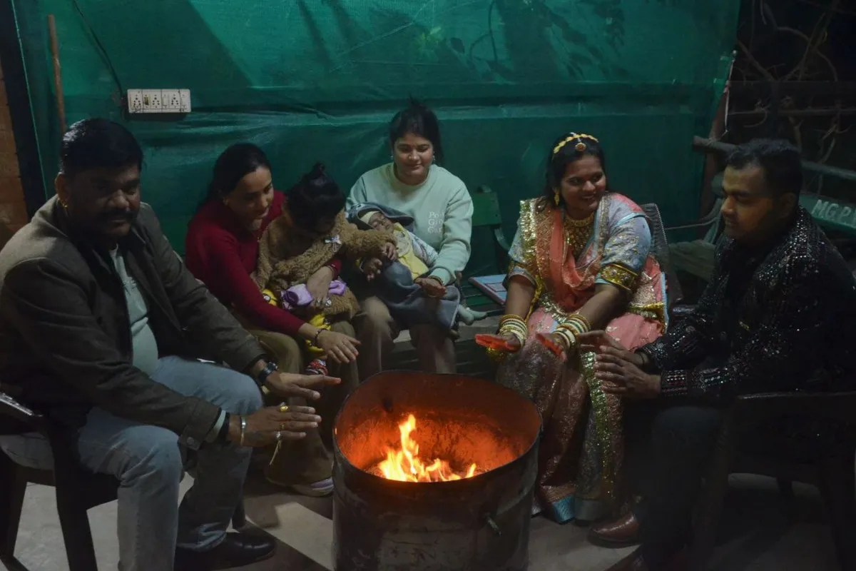 ठंड से बचाव के लिए अलाव तापता एक परिवार। फोटो- पत्रिका