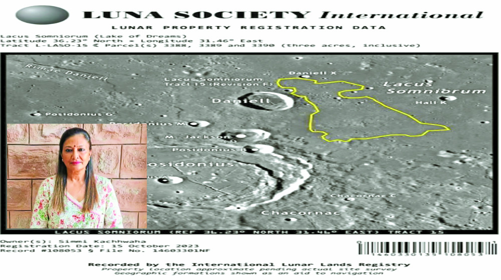 शहर के एक निजी स्कूल की शिक्षिका ने सिम्मी कच्छवाहा ने इस दिपावली को यादगार बनाने के लिए अनूठी खरीदारी की है। उन्होंने 201.28 डॉलर (16726 रुपए) खर्च कर चांद पर 3 एकड़ जमीन (लेक ऑफ ड्रीम्स) खरीद ली। यह जमीन चांद के नोर्थ पोल पर है, जो इंटरनेशनल लूनर लैण्ड्स रजिस्ट्री में रिकार्ड है। सिम्मी ने बताया कि भविष्य में मौका मिलेगा तो स्पेस टूरिज्म में जाना चाहूंगी।