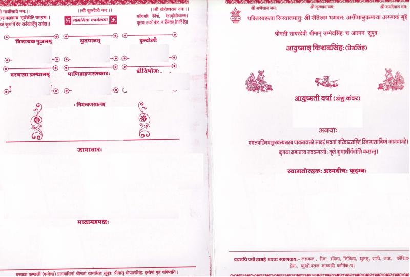 यहां परिवार के पुत्र के विवाह का पूरा निमंत्रण पत्र संस्कूत भाषा में छपवाया गया था। जिसमें विवाह संबंधी सभी कार्यक्रम पूर्णरूप से संस्कृत भाषा में लिखे गए थे।