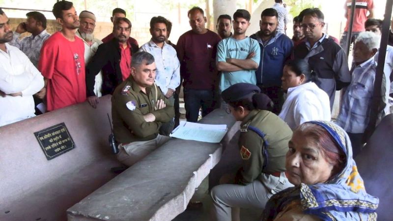 मोर्चरी के बाहर कार्रवाई करते पुलिस अधिकारी व मौजूद परिजन