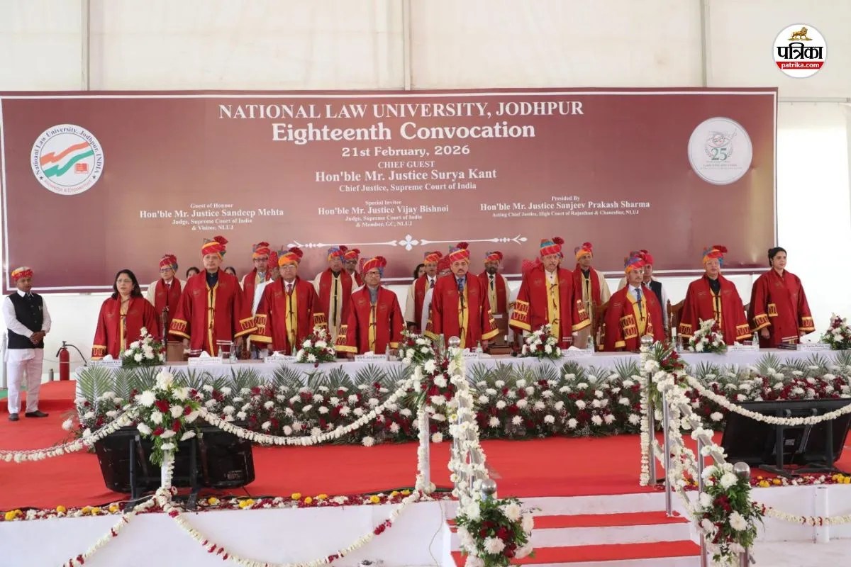 Jodhpur News: राष्ट्रीय विधि विश्वविद्यालय, जोधपुर में शनिवार को 18वां दीक्षांत समारोह आयोजित किया गया। यह समारोह विश्वविद्यालय के रजत जयंती वर्ष यानी 25 वर्षों की शैक्षणिक यात्रा के उपलक्ष्य में खास रहा। कार्यक्रम में बड़ी संख्या में विद्यार्थी, अभिभावक, संकाय सदस्य और न्यायिक क्षेत्र की प्रमुख हस्तियां मौजूद रहीं।