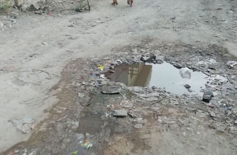 राणीजी का थान कॉलोनी में सड़क पर हुए गड्ढे में जमा पानी