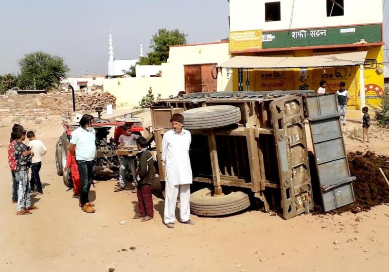 उन्हें बचाने के चक्कर में ट्रैक्टर चालक का संतुलन बिगड़ गया और ट्रैक्टर सड़क किनारे बने नाले के ऊपर से होकर पास के गड्ढे में उतर गया। साथ ही इस दौरान ट्रैक्टर गोबर खाद से भरी ट्रॉली भी पलट गई। लेकिन गनीमत रही कि इस हादसे में ट्रैक्टर चालक अथवा बाइक पर सवार युवकों में से किसी को भी कोई चोटें नहीं आई और पास ही खेल रहे बच्चों तक पहुंचने से पहले ही ट्रॉली पलट जाने से बड़ा हादसा भी टल गया।