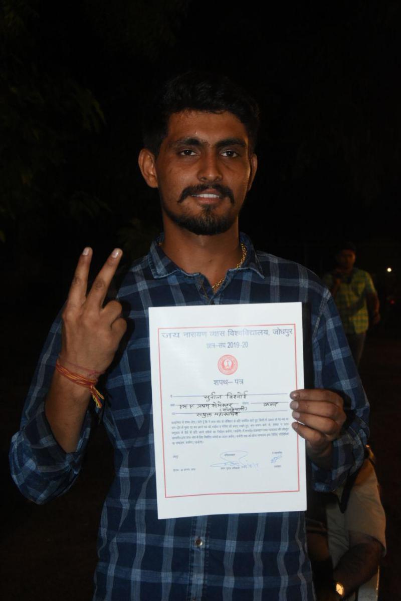 जोधपुर.जयनारायण व्यास विश्वविद्यालय छात्र संघ चुनाव मतगणना के परिणाम जैसे जैसे सामने आते गए, वैसे-वैसे जीतने वाले उम्मीदवारों और उनके समर्थक छात्र-छात्राओं के चेहरों पर खुशी छा गई और कैम्पस में जश्न का माहौल हो गया। मतणगना के अनुसार जोधपुर.जयनारायण व्यास विश्वविद्यालय ( jainarain vyas university ) छात्र संघ चुनाव परिणाम ( Student union election result update ) बहुत दिलचस्प और मजेदार रहे। इस दौरान उम्मीदवारों के बीच रोचक मुकाबला हुआ। मुकाबले के दौरान एबीवीपी ( ABVP ) के सुनील विश्नोई ( sunil vishnoi ) संयुक्त महासचिव ( joint general secretary ) निर्वाचित हुए। इस मौके उन्हें निर्वाचित होने का प्रमाण पत्र प्रदान किया गया।