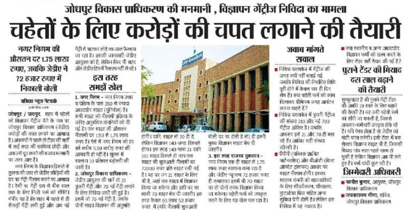 जोधपुर. विज्ञापन गेंट्रीज के टेंडर में जेडीए अधिकारियों की मनमानी के खेल पर सोमवार को ब्रेक लग गया है। राजस्थान पत्रिका ने जेडीए अधिकारियों के मनमाने खेल को उजागर किया। इसके बाद चहेती फर्म को उपकृत करने वाला टेंडर सोमवार को निरस्त कर दिया गया। विज्ञापन गेंट्रीज का टेंडर अब नए सिरे से होगा।