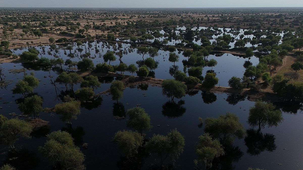 बालोतरा। जिले के डोली अराबा क्षेत्र के खेतों और जमीन में भरा प्रदूषित पानी।