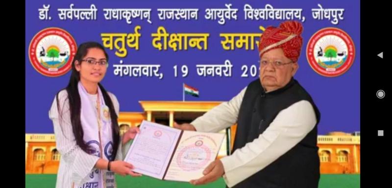 राज्यपाल ने टॉपर विद्यार्थियों को गोल्ड मेडल पहनाए। स्नातक आयुर्वेद में टॉपर कल्पना यादव, होम्योपैथिक में शिवानी अग्रवाल, बीएससी नर्सिंग में सुमन, स्नातक यूनानी में उमी अमीन और प्राकृतिक चिकित्सा व योगा में रामलाल को गोल्ड मेडल मिला।