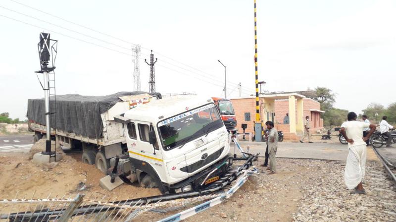 मालगाड़ी के पहुंचने से पहले अनियंत्रित ट्रेलर रेलवे क्रॉसिंग किनारे से टकराया, बड़ा हादसा टला