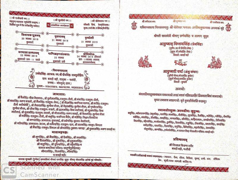 जोधपुर. बावड़ी कलां गांव के जिस राजपुरोहित परिवार ने संस्कृत भाषा को बढ़ावा देने, प्रचार-प्रसार करने तथा आमजन को संस्कृत से जोडऩे के लिए विवाह का निमंत्रण पत्र संस्कृत भाषा में छपवाया है,वहां २२ नवम्बर को शादी होगी। यहां समारोह में आने वाले लोगों की जुबां पर संस्कृत का कार्ड फेमस हो गया है। अस्मदीय: कुटुम्ब सरीके शब्दों से लोग चक्करघिनी हो गए। बताते चलें कि जोधपुर जिले के बावड़ी कलां निवासी उम्मेदसिंह के पुत्र किशन सिंह का विवाह २२ नवम्बर को है। किशनसिंह वर्तमान में रामदेवरा में व्याख्याता है तथा दिल्ली विश्वविद्यालय से संस्कृत में एमए, नेट जेआरफ व एमफिल है। उनके भाई व्यवसायी भंवरसिंह व व्याख्याता सवाईङ्क्षसह राजपुरोहित संस्कृत के प्रचार-प्रसार में लगे है। उन्होंने संस्कृत भाषा को लोगों के दैनिक जीवन में उपयोग में लाने के लिए प्रेरित करने के उद्देश्य से विवाह का निमंत्रण पत्र संस्कृत भाषा में छपवाया है। निमंत्रण पत्र में विवाह संबंधित कार्यक्रमों के लिए विनायक पूजनम्, घृतपानम्, वृन्दोली, वरयात्रा प्रस्थानम्, पाणिग्रहण संस्कार:, प्रीतिभोज: तथा निमंत्रणस्थलम्, जामातार:, मातामहपक्ष:, स्वागतोत्सुक: अस्मदीय: कुटुम्ब:, वयमपि प्रतीक्षामहे भवतां स्वागताय: आदि शब्दों का प्रयोग किया है।