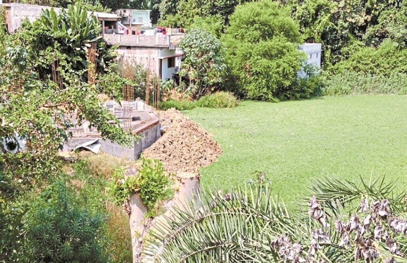 तालाब में अतिक्रमण कर बनाया जा रहा भवन