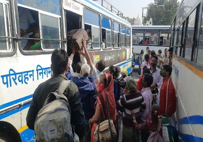 कन्नौज. कन्नौज में भाई दूज पर उमड़ी भीड़ के चलते एक अजब गजब नजारा दिखाई पड़ा। जहां एक ओर बस अड्डे पर जबरदस्त भीड़ दिखाई पड़ी तो वहीं भीड़ के चलते बस में सफर करने के लिए महिलाएं बस की खिड़की से घुसती नजर आई और तो और इस बीच लोग कोरोना के खौफ से बेखौफ नजर आए।