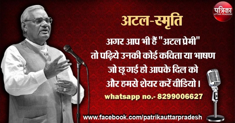 अगर आप भी हैं अटल प्रेमी तो रिकॉर्ड करिये उनकी कोई कविता या भाषण, जिसने आपके दिल को छू लिया हो और हमसे शेयर करिये। हमारा वाट्सएप नंबर है 8318143602